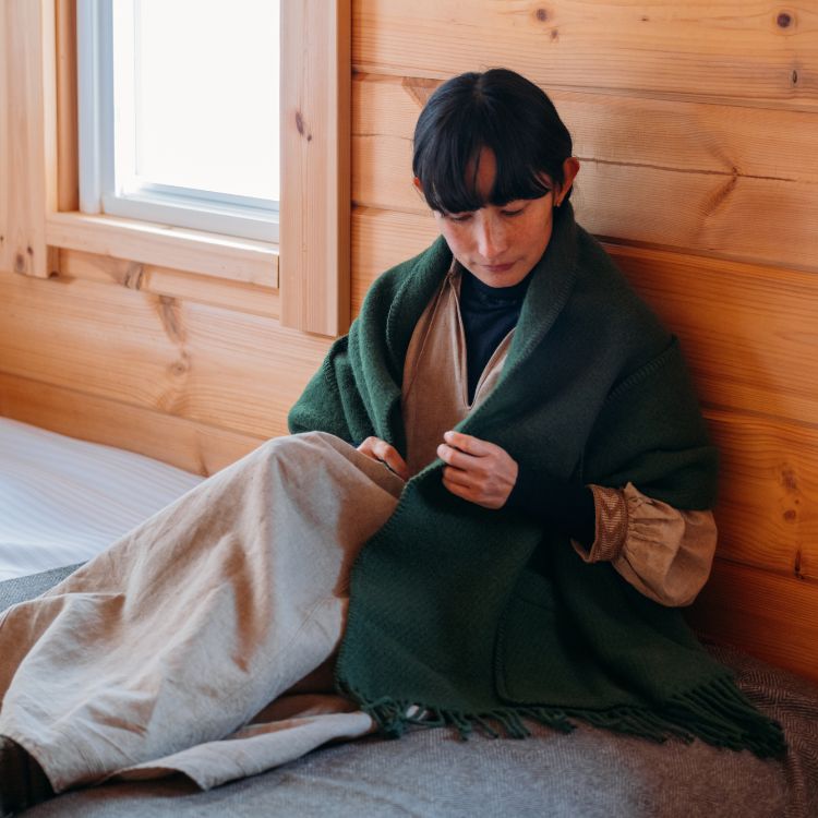 ピュアニューウールとは、 1年以内に刈りとられた羊毛のことを指します。ラプアンカンクリではロングセラーのポケットショールやブランケット、湯たんぽに用いられており、軽くて通気性が良いのが特徴です。そのため羽織ったり掛けたりしても負担になりにくく、軽やかに過ごせるんです。